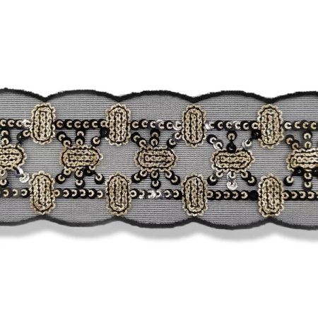 passamaneria ricamata ai bordi e realizzata in tessuto di tulle con ricami in lurex oro e paillettes mm 65