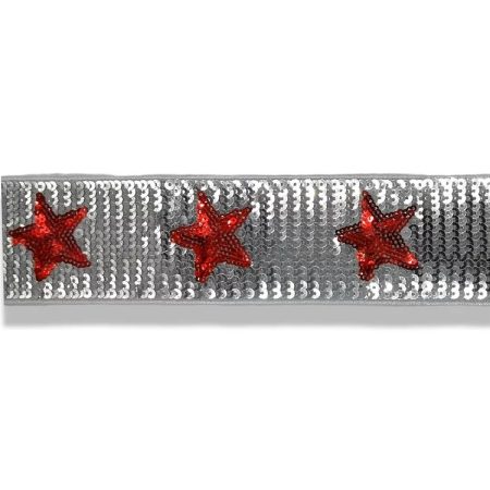 passamaneria ricamata in tinta ai bordi e con paillettes argentate lucide, con al centro disegnata una stella in paillettes ross