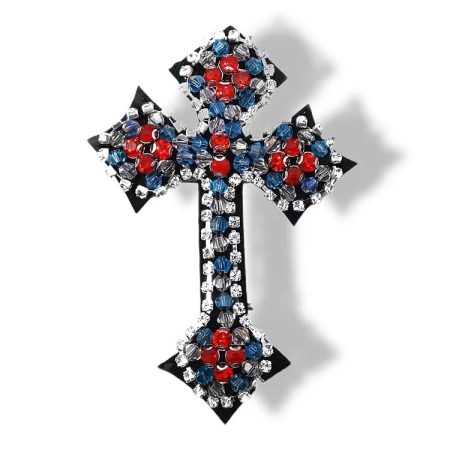 applicazione a forma di croce, realizzata con pietre, corallini e una fila di strass che ne delinea i bordi 6,5 cm x 9,6 cm