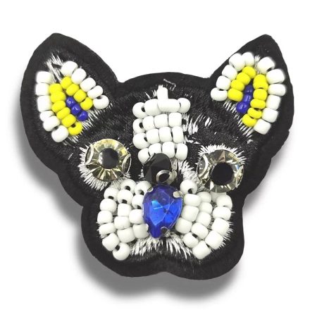 applicazione a forma di cane interamente ricamata a mano e impreziosita da corallini e pietre in vetro cucite a mano 5 cm x 5 cm