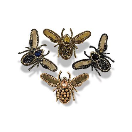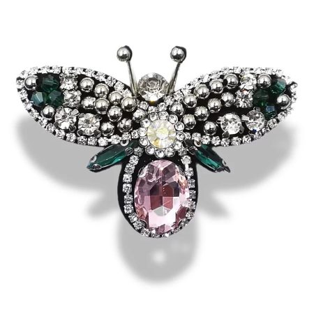 applicazione a forma di ape, realizzata con pietre, file di strass e paillettes ricamate sulle ali 7,5 cm x 5 cm