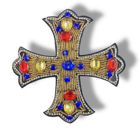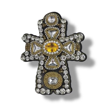 applicazione a forma di croce interamente ricamata a mano e decorata con pietre acriliche, strass e corallini cuciti a mano 15,8