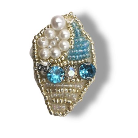 applicazione a forma di conchiglia interamente composta da corallini, pietre in vetro e perle crema cucite a mano 4,5 cm x 3 cm