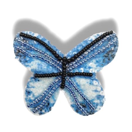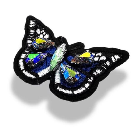 applicazione a forma di farfalla, ricamata interamente a macchina, con pietre applicate al centro del ricamo 10 cm x 8 cm