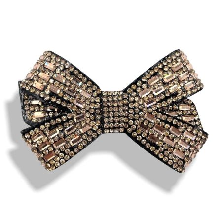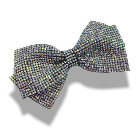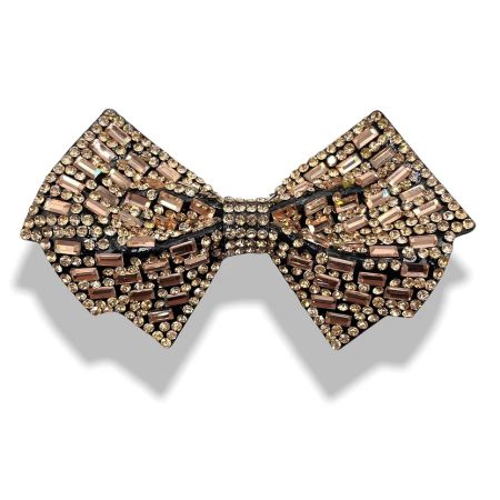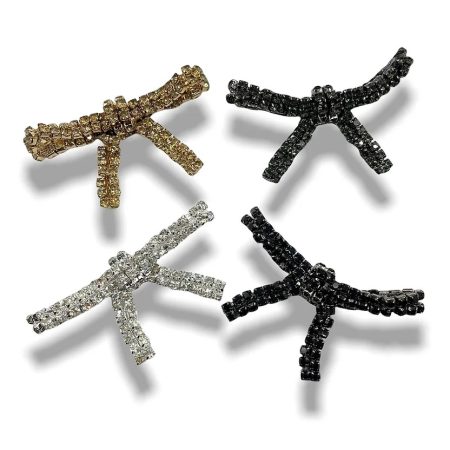 applicazione a forma di fiocco saldato, realizzato con file di strass 7.5 cm x 3.5 cm circa.