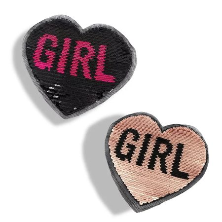 applicazione a forma di cuore, realizzata con piaillettes reversibili interamente ricamate a macchina e la scritta girl a contra