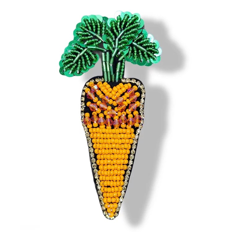 applicazione a forma di carota, realizzata con cannottiglie, paillettes ricamate e file di corallini, con una fila di strass che