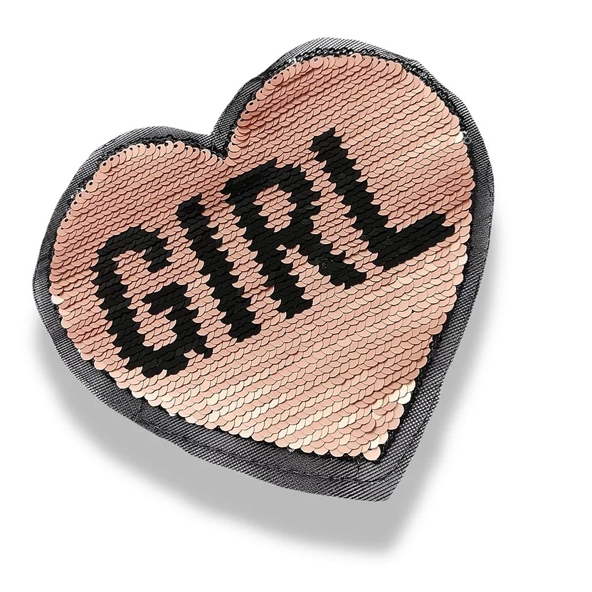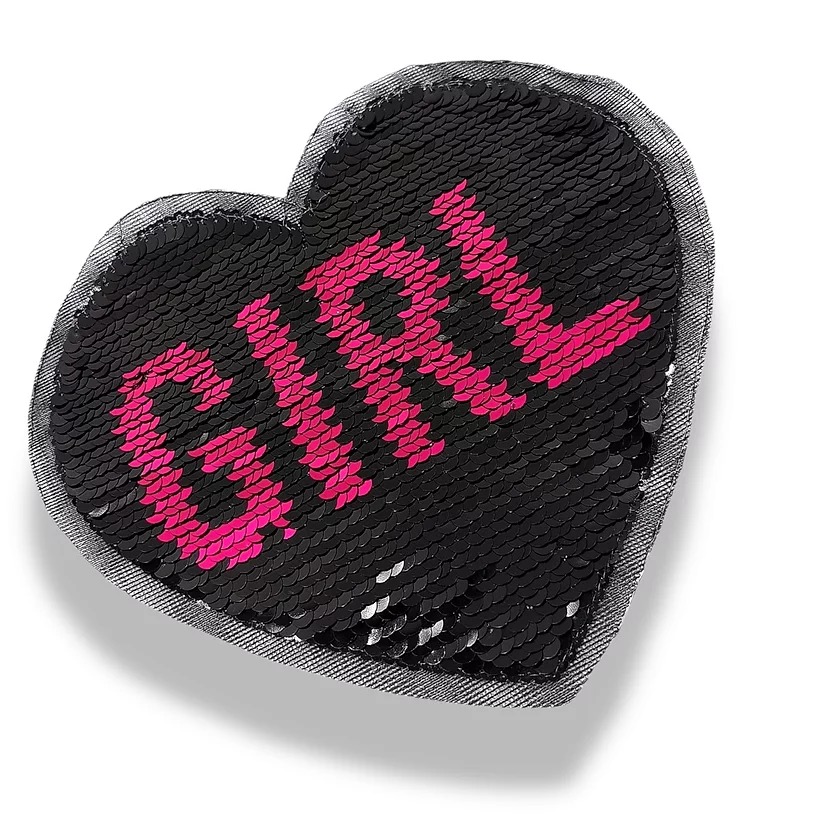 applicazione a forma di cuore, realizzata con piaillettes reversibili interamente ricamate a macchina e la scritta girl a contra