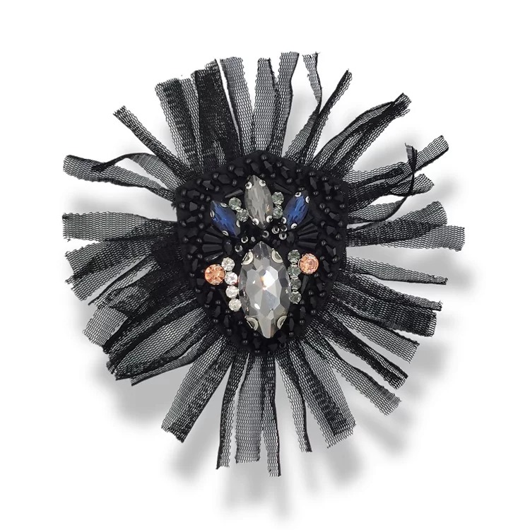 applicazione a forma di goccia, realizzata con pietre, corallini, strass e file di perline nere, con frange di tessuto di tulle