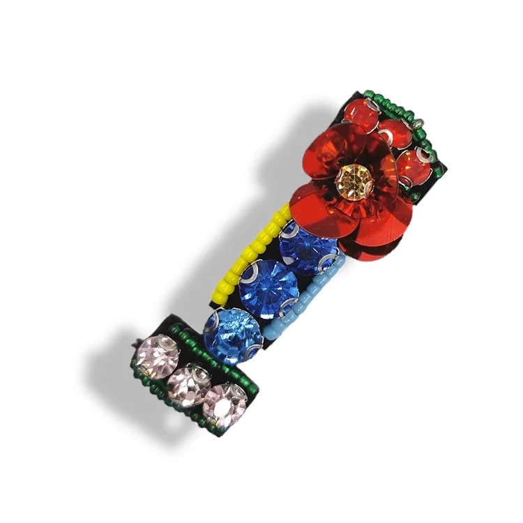 applicazione a forma di lettera ” i ” , realizzata con pietre, file di corallini ricamate e un fiore, formato da paillettes e un