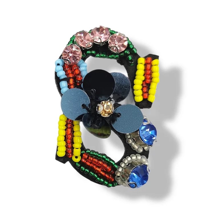 applicazione a forma di lettera s, realizzata con pietre, file di corallini ricamate e un fiore centrale, formato da paillettes