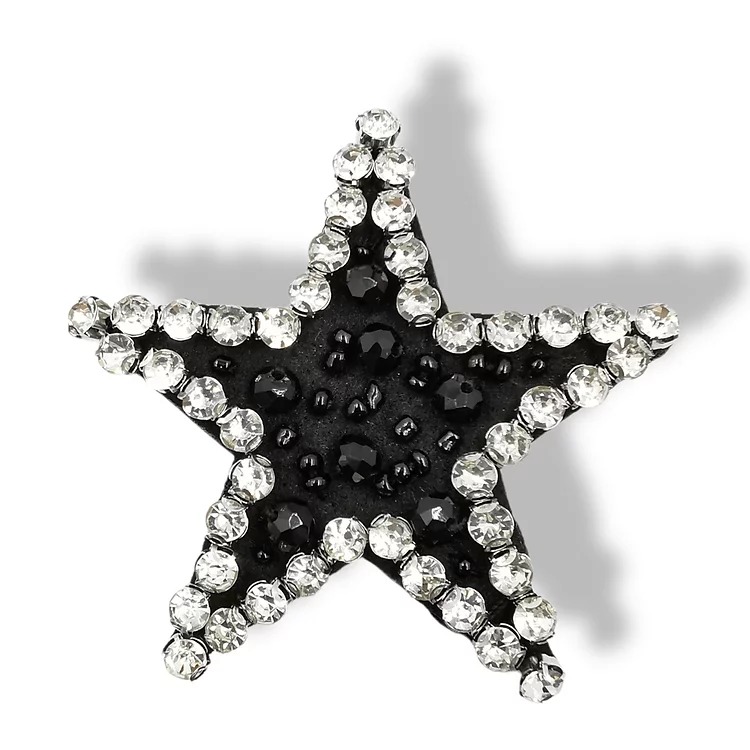 applicazione a forma di stella, realizzata con pietre e corallini neri e una catena di pietre crystal che ne delinea il bordo 7