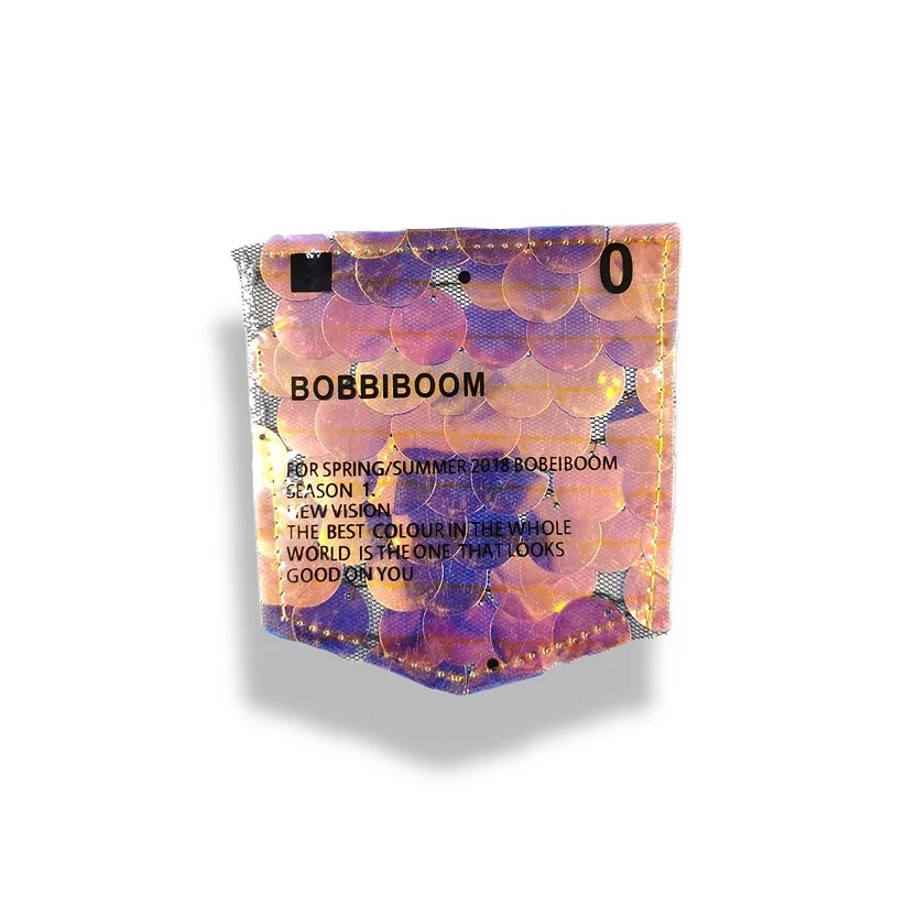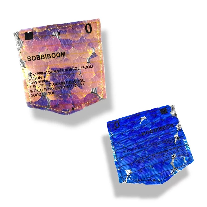 applicazione a forma di taschino, la parte inferiore È realizzata su base tulle con paillettes crystal ab ricamate e la parte su