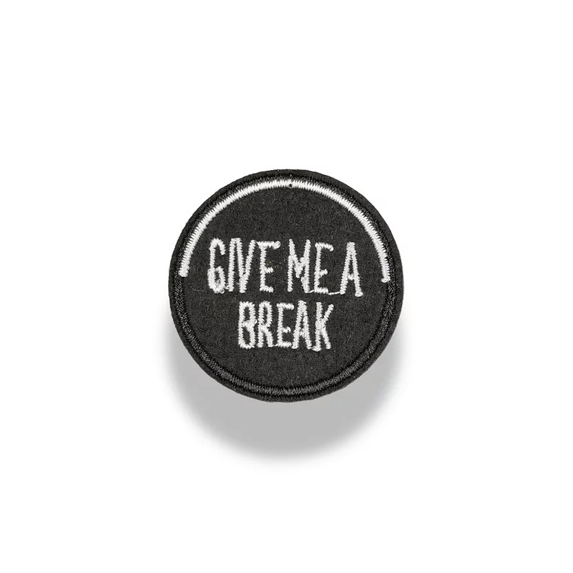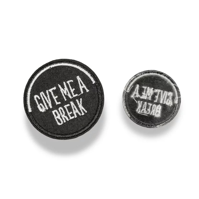 applicazione circolare e termoadesiva , ricamata interamente a macchina con la scritta bianca in evidenza 3,5 cm x 3,5 cm