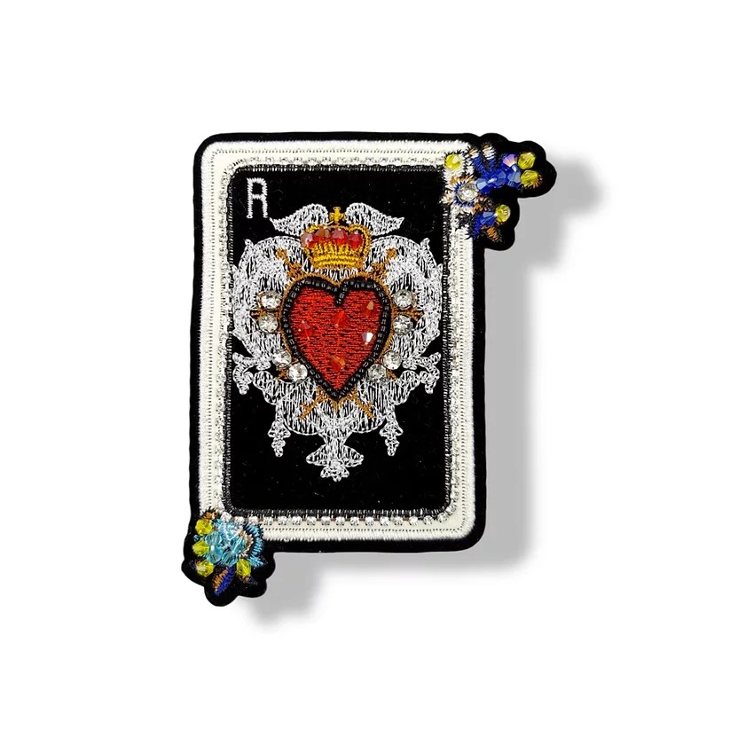 applicazione completamente ricamata a macchina, raffigurante una carta da gioco. realizzata con pietre ricamate e file di strass