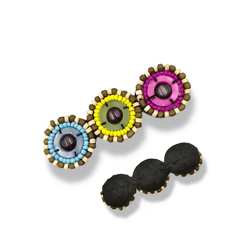 applicazione con tre pietre centrali racchiuse da un inserto in plastica e contornate da due file di corallini che ne delineano