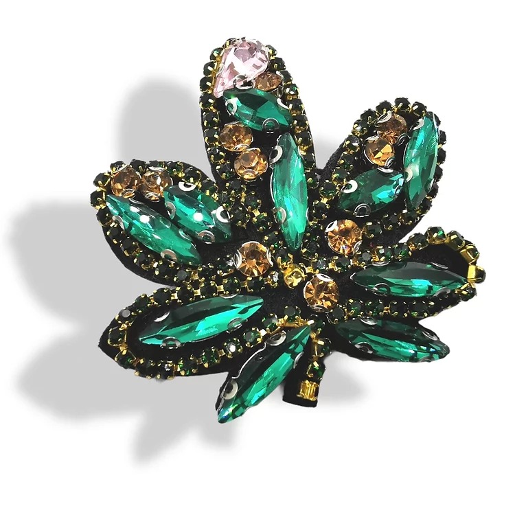 applicazione cucita interamente a macchina, raffigurante una foglia realizzata con pietre di vetro colorato e una catena di stra