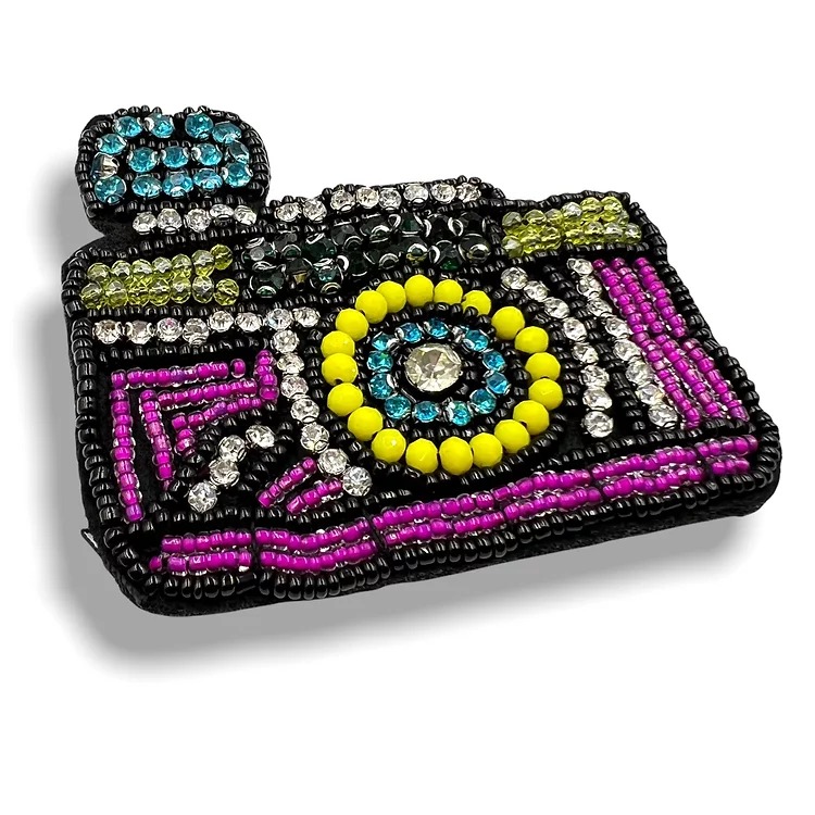 applicazione forma di macchina fotografica con pietre e corallini cucito a mano 7 cm x 8 cm