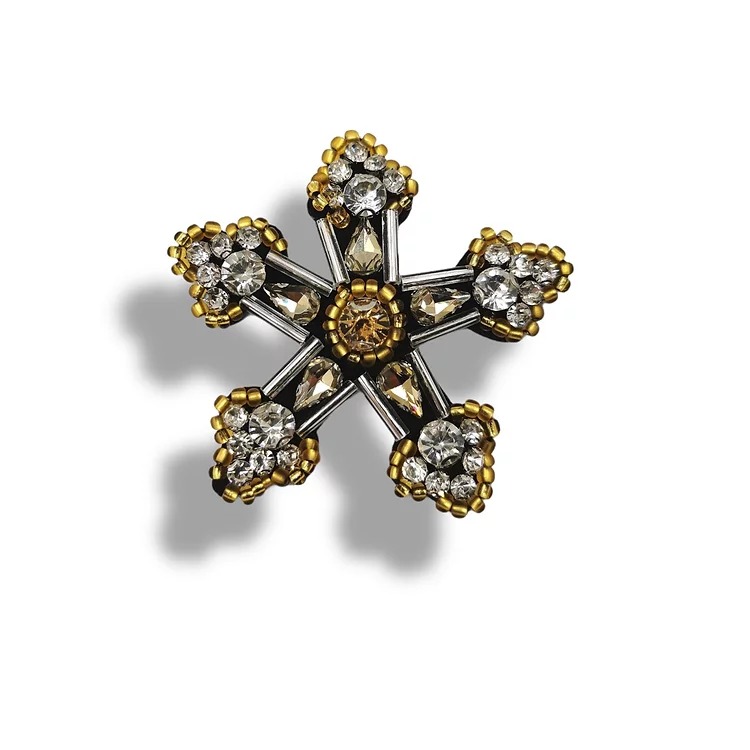 applicazione interamente composta da pietre in vetro, corallini e canottiglie cucite a mano a forma di stella 6 cm x 6,5 cm.