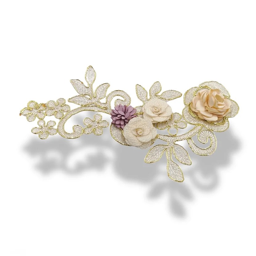 applicazione interamente ricamata a macchina con filo lurex, con fiorellini in tessuto applicati sul ricamo 20 cm x 11cm