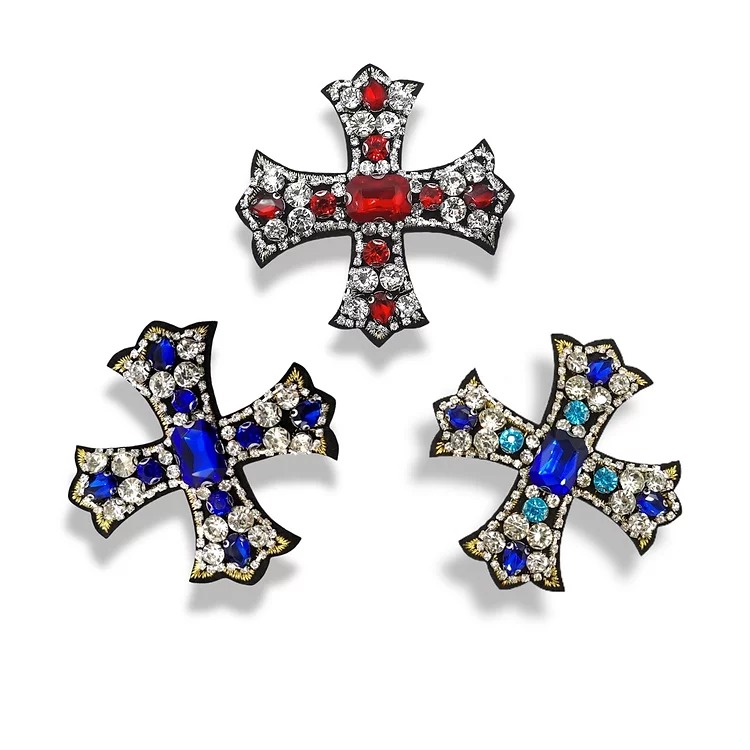 applicazione interamente ricamata a macchina, raffigurante una croce, realizzata con pietre colorate e crystal, e una catena di