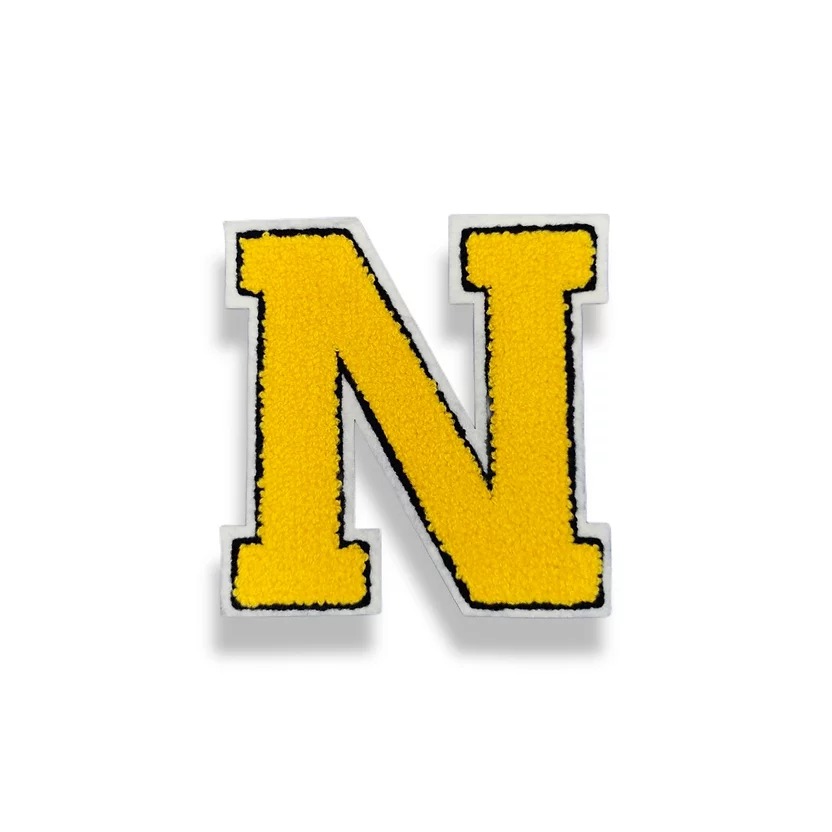 applicazione raffigurante la lettera maiuscola ” n “, interamente ricamata in punto spugna giallo su base panno lenci bianca 13