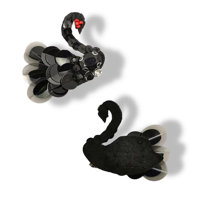 applicazione raffigurante un cigno nero, realizzata con paillettes ricamate e pietra centrale nera, su base panno lenci 3,5 cm x