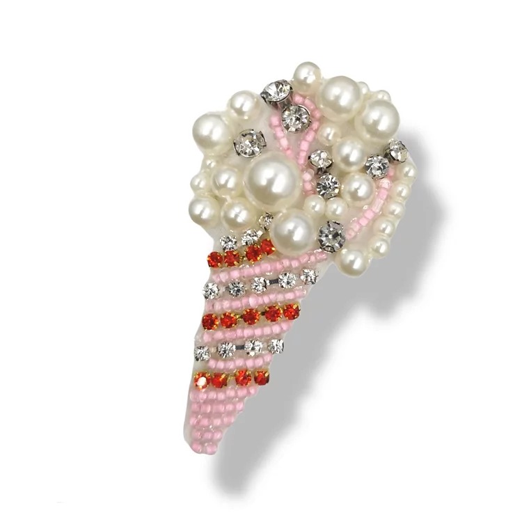 applicazione raffigurante un cono gelato, realizzata con file di strass, corallini, pietre e perline 3,5 cm x 7 cm