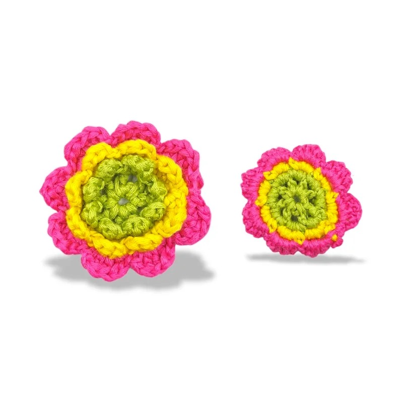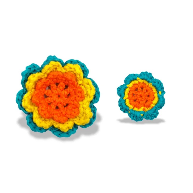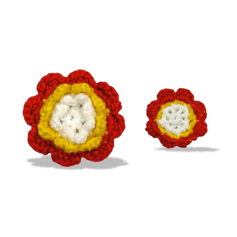 applicazione raffigurante un fiore con petali sovrapposti, realizzata interamente ad uncinetto, con fili di lana circonferenza d