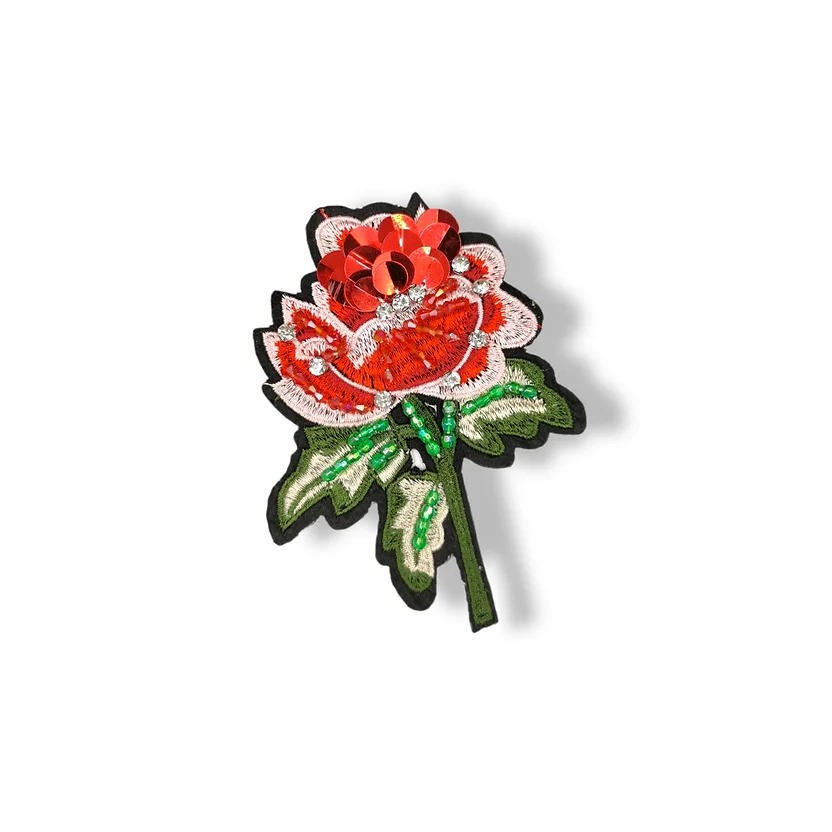 applicazione raffigurante un fiore, interamente ricamata a macchina, con inserti di paillettes, file di corallini e pietre cryst