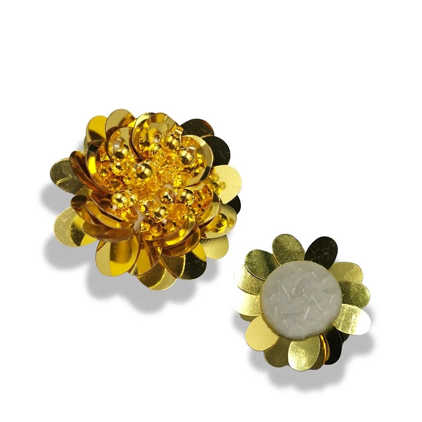 applicazione raffigurante un fiore, realizzata con file di corallini gold e paillettes gold , ricamate e sovrapposte a forma di