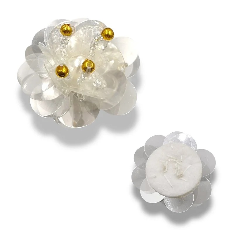 applicazione raffigurante un fiore, realizzata con perla centrale e file di corallini, con paillettes lucide a forma di petali,
