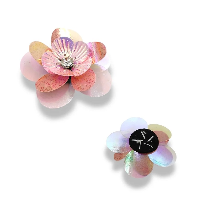 applicazione raffigurante un fiore, realizzata con pietra centrale di color crystal e paillettes lucide e rigate a forma di peta