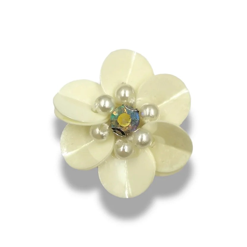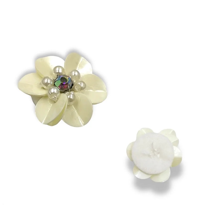 applicazione raffigurante un fiore, realizzata con pietra centrale e file di perline, con paillettes lucide ricamate tra di loro
