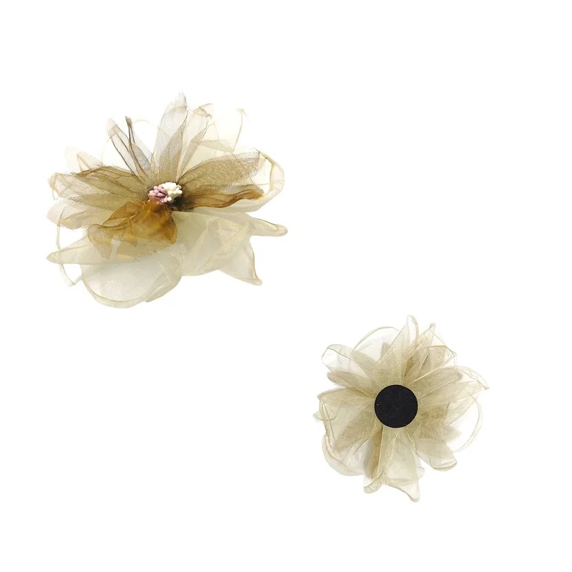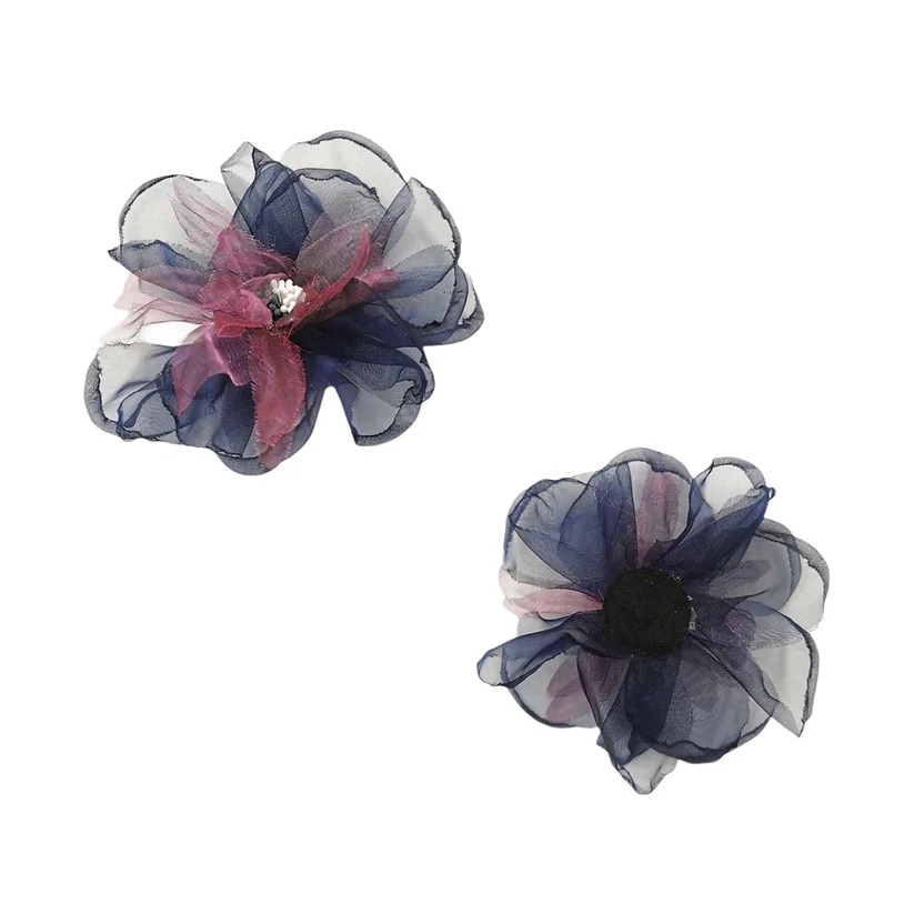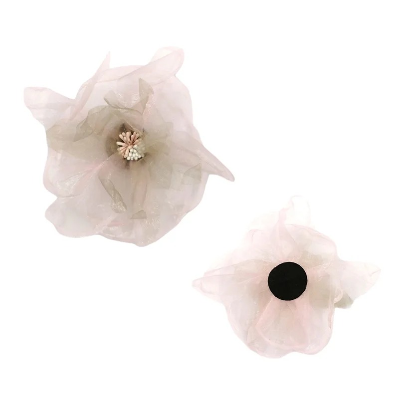 applicazione raffigurante un fiore, realizzata con tessuto di organza a strati sovrapposti e applicazione centrale, ricamata a m