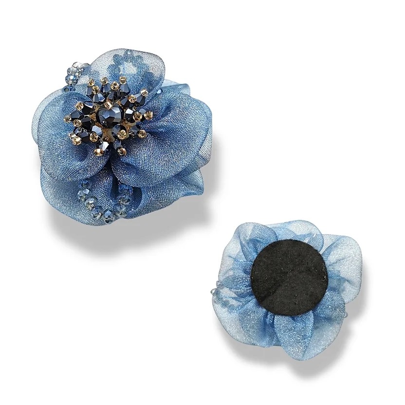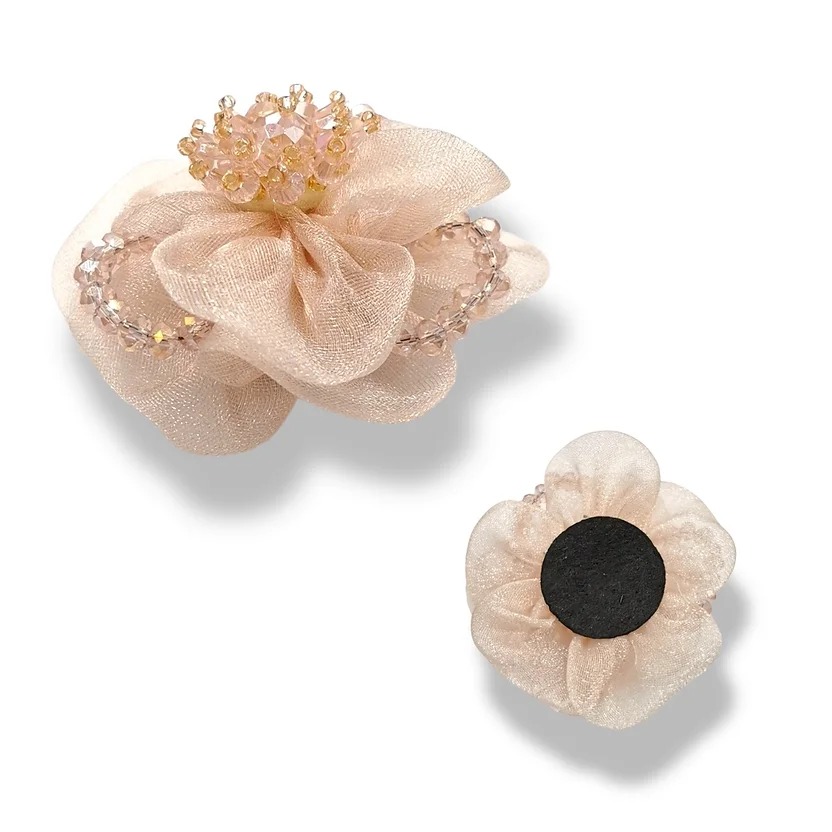 applicazione raffigurante un fiore, realizzata in organza con pietre e corallini sfaccettati ricamati al centro e con file di co