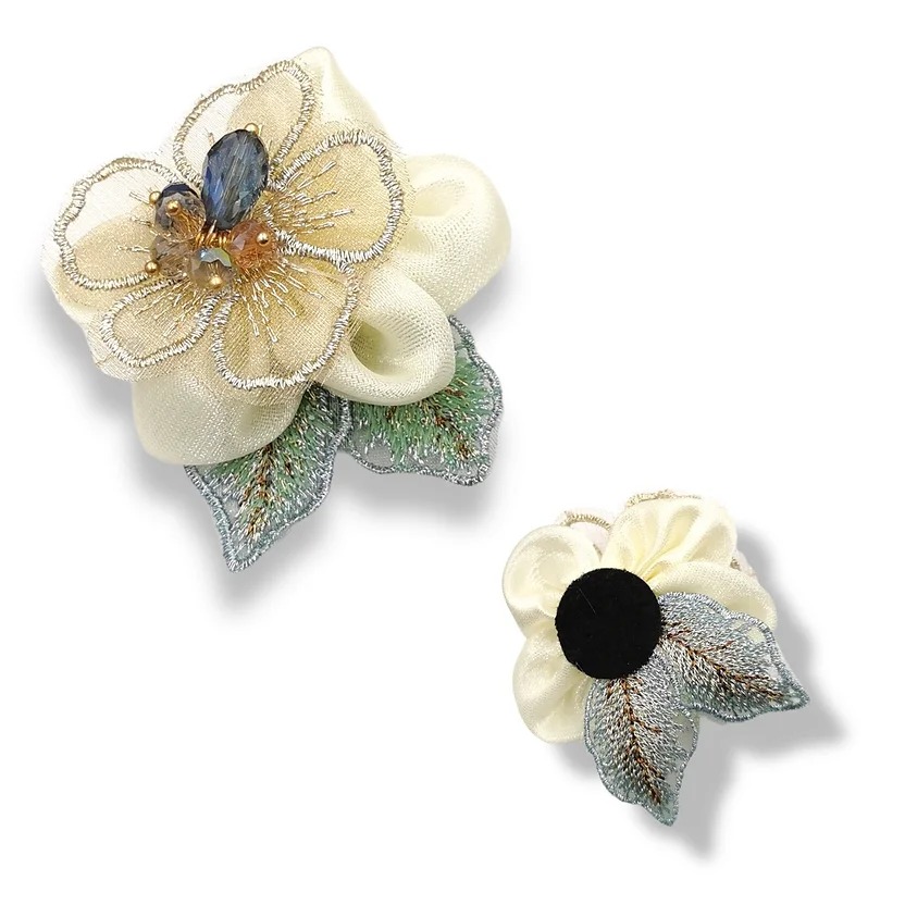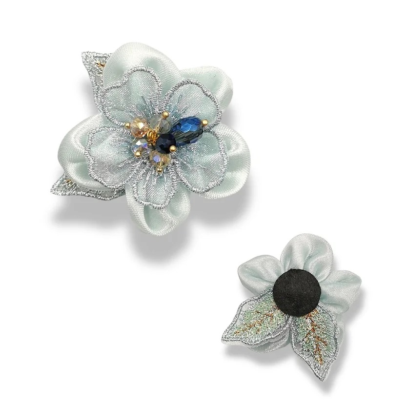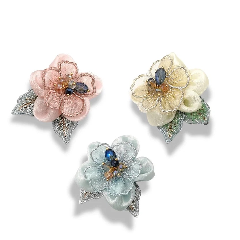 applicazione raffigurante un fiore, realizzata in organza con pietre e corallini sfaccettati ricamati al centro, e foglie ricama
