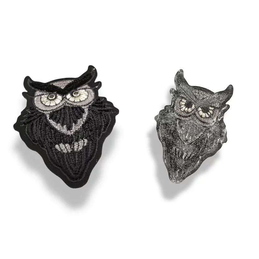 applicazione raffigurante un gufo, ricamata interamente a macchina, con dettagli in filo lurex e due pietre a definire gli occhi