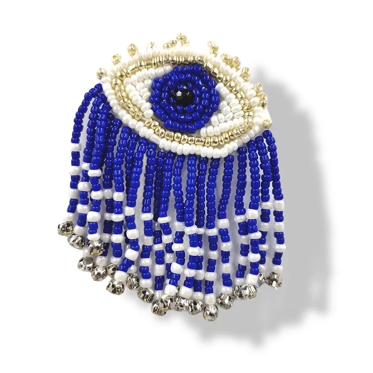 applicazione raffigurante un occhio, composto interamente da corallini. i pendenti sono composti da file di corallini cuciti a m
