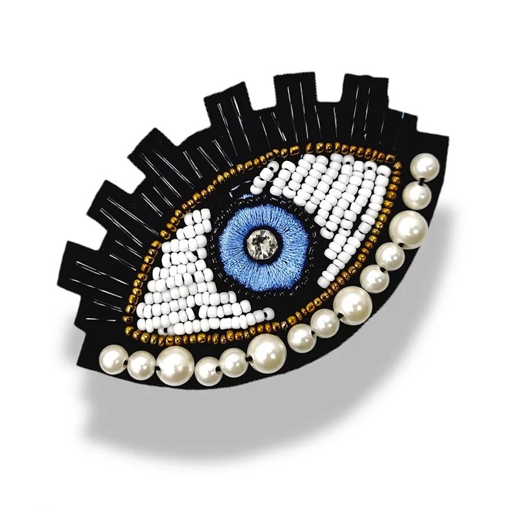 applicazione raffigurante un occhio, realizzata con file di corallini e perline, con una pietra centrale 6 cm x 9 cm