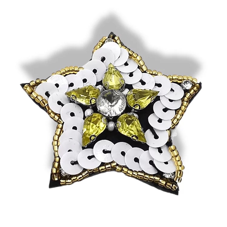 applicazione raffigurante una stella, realizzata con pietre e paillettes ricamate a mano, e una catena di strass che ne delinea