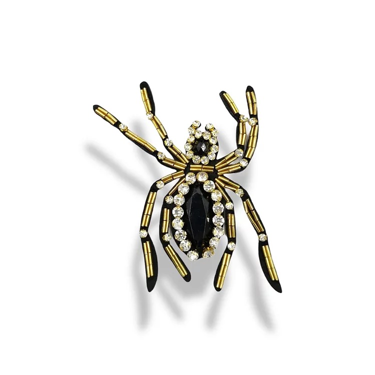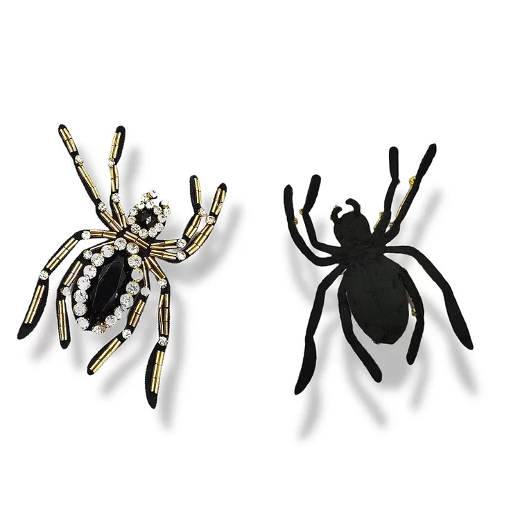applicazione ragno ricamata interamente su base panno lenci e realizzata con una pietre nere, pietre castonate di color crystal