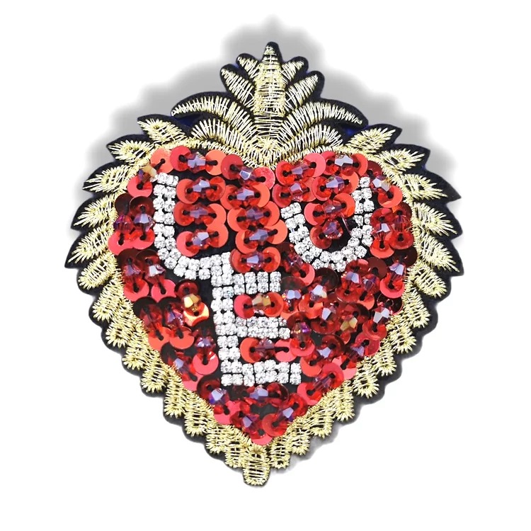 applicazione ricamata raffigurante un cuore, realizzata con paillettes e pietre ricamate e file di strass che compongono le lett