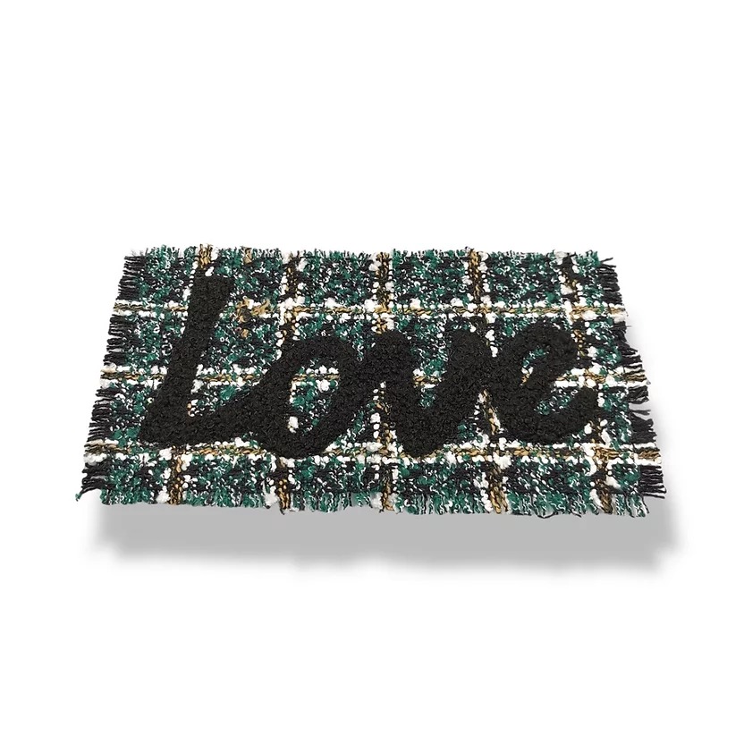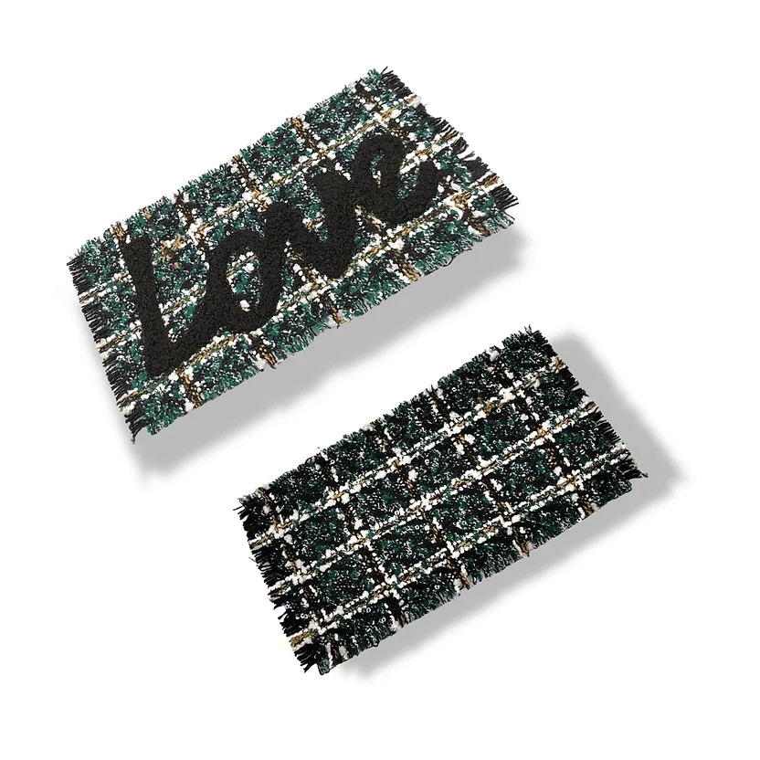 applicazione riportante al centro la scritta ” love ” realizzata in punto spugna, patchgrande sviluppata su tessuto scozzese 13