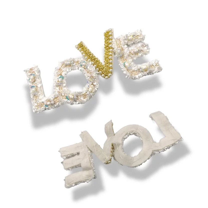 applicazione riportante la scritta ” love “, patchgranderealizzata su base panno lenci con paillettes e perline ricamate con fil