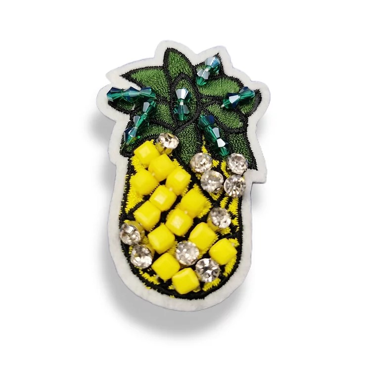 applicazione termoadesiva a forma di ananas interamente ricamata a mano e decorata con corallini e pietre in vetro cucite a mano