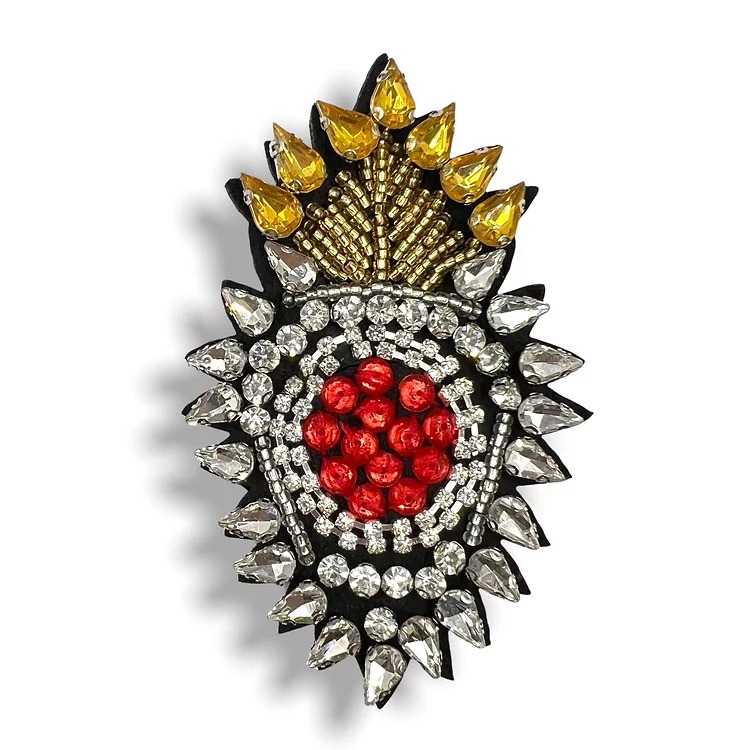 applicazione termoadesiva a forma di cuore sacro arricchita con pietre in vetro, acrilico e corallini cuciti 5,5 cm x 8,8 cm