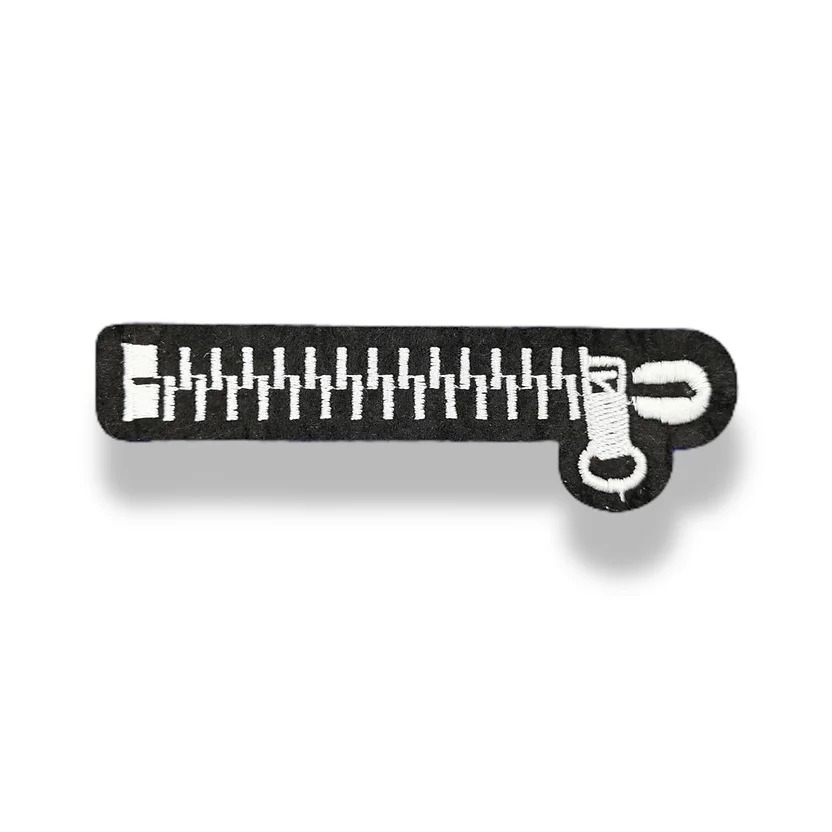 applicazione termoadesiva e ricamata con filo argento su fondo nero, raffigurante una cerniera 3,4 cm x 11,7 cm