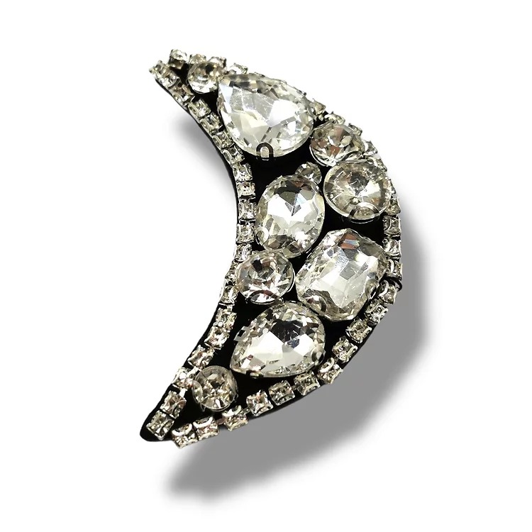 applicazione termoadesiva interamente composta da pietre in vetro, cucite a mano e fila di strass a forma di mezza luna 6,5 cm x