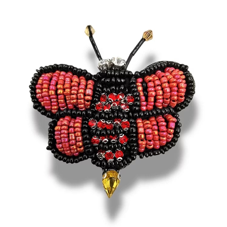 applicazione termoadesiva interamente composta da pietre in vetro e corallini cuciti a mano a forma di ape 5 cm x 6 cm.
